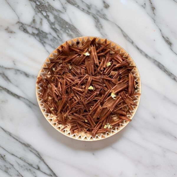 Œufs pasteurisés, Matières grasses végétales, Lécithines de soja, Noisettes, Sauce chocolat à base de glucose, Poudre de cacao, Or alimentaire, Pralin, Chocolat noir 70 % de cacaos, Zest d’orange confis
